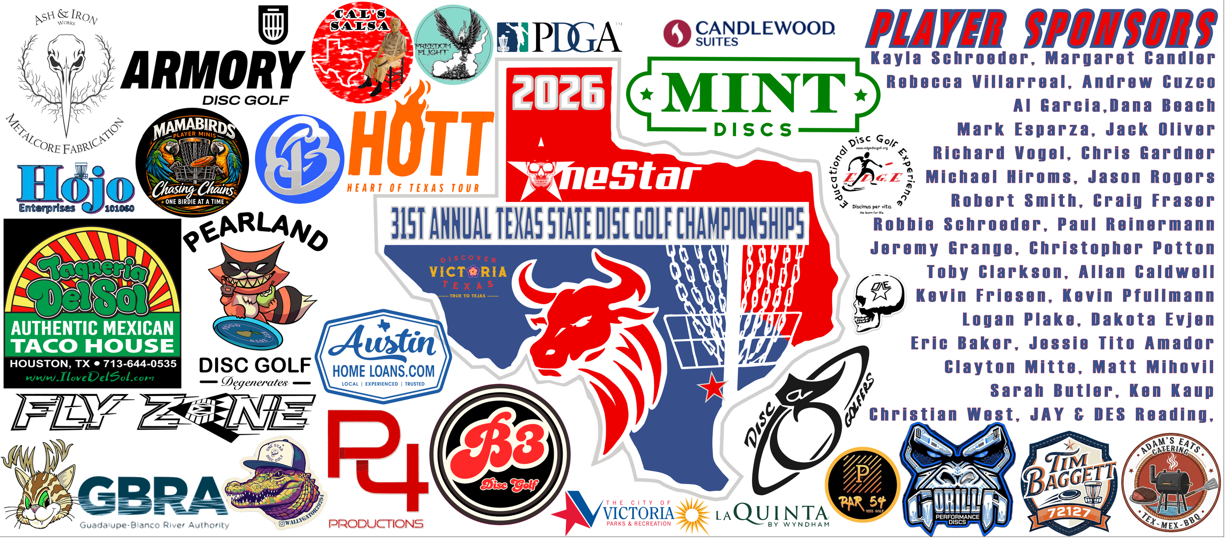 Sponsored By: OneStar Disc Golf, MINT DISC ATX, Golden Crescent DGC, Gorilla Disc Golf, CRUSH Disc Golf, EXPLORE VICTORIA, IRON SHARPENS IRON BBQ, Lone Star Hardware & Paint, Paragon Discgolf, Reliable Residential Services, Palm Harbor Homes, WILD DISCS, ON-DECK Renovations, Grass Choppers Landscaping, THE RANCH, PAR 54 Disc Golf, 3rd Coast Disc Golf, Upper Park Disc Golf, Gopher Disc Golf Club, JYM Strength & Conditioning, The Texas ZOO, BIG Country Beef Jerky, OUTLAW PASS, Axe society, Flowers Massage Therapy, Poesta Creek Highflyer Discgolf, WASTE MANAGMENT, DYE DAILY, tropical smoothie café, Bogey Free Club, freedom flight discs, Hill Country Hyzers DGC, Lucky Ace, PUZZLE PIECE CATERING and by your business, company and/or your player sponsorship. (ASK US HOW TO BECOME A SPONSOR)